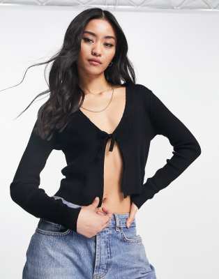 Miss Selfridge black tie front long sleeve ribbed top BLACK ASOS